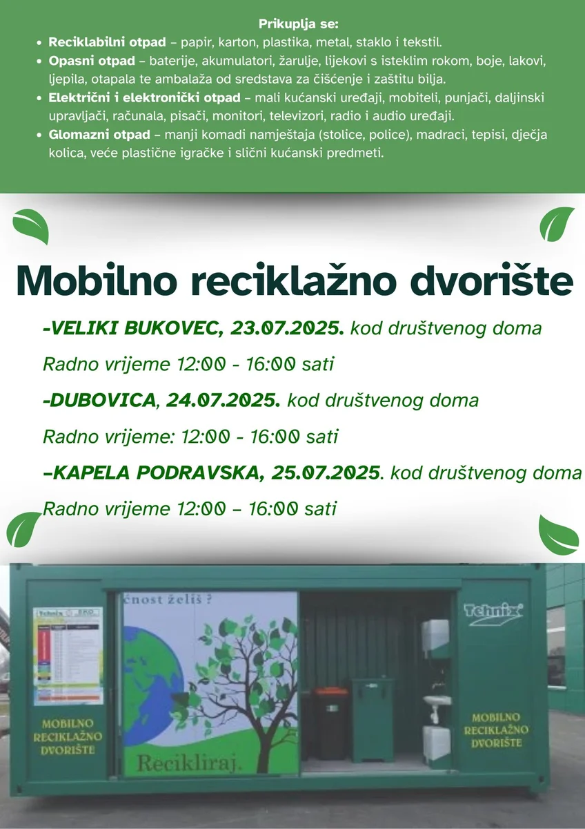 MOBILNO RECIKLAŽNO DVORIŠTE U VAŠEM MJESTU Poštovani mještani, U sklopu redovitih aktivnosti gospodarenja otpadom, na području Općine Veliki Bukovec organizirano je mobilno reciklažno dvorište, uz mogućnost da svaki mještanin besplatno preda svoj otpad, bez obzira iz kojeg naselja dolazi.